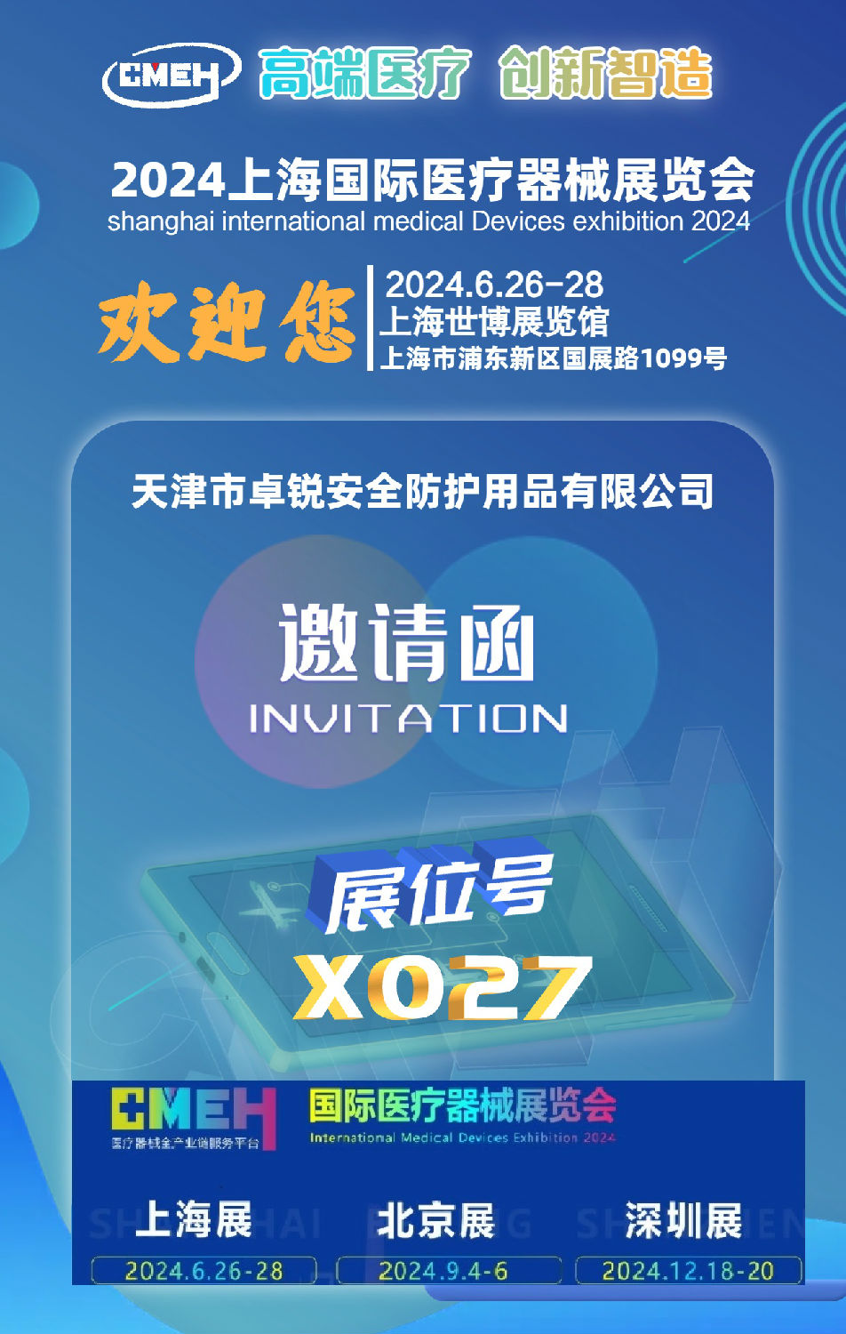 上海国际医疗器械展览会定于2024年6月26日-6月28日在上海世博展览馆举办,内容全面涵盖了包括医用电子、医学影像设备、智能医疗、病房护理及辅助设备、医用敷料、体外诊断试剂、光学急救、康复护理以及医疗信息化等,直接并全面服务于医疗器械行业从源头到终端医疗产业链,展会坚持走专业化的特色发展道路,以推动产业升级、行业创新发展为己任,为买家采购交流提供一个医疗行业的饕餮盛宴!销售总监:杨浩18964878976(微信同号)